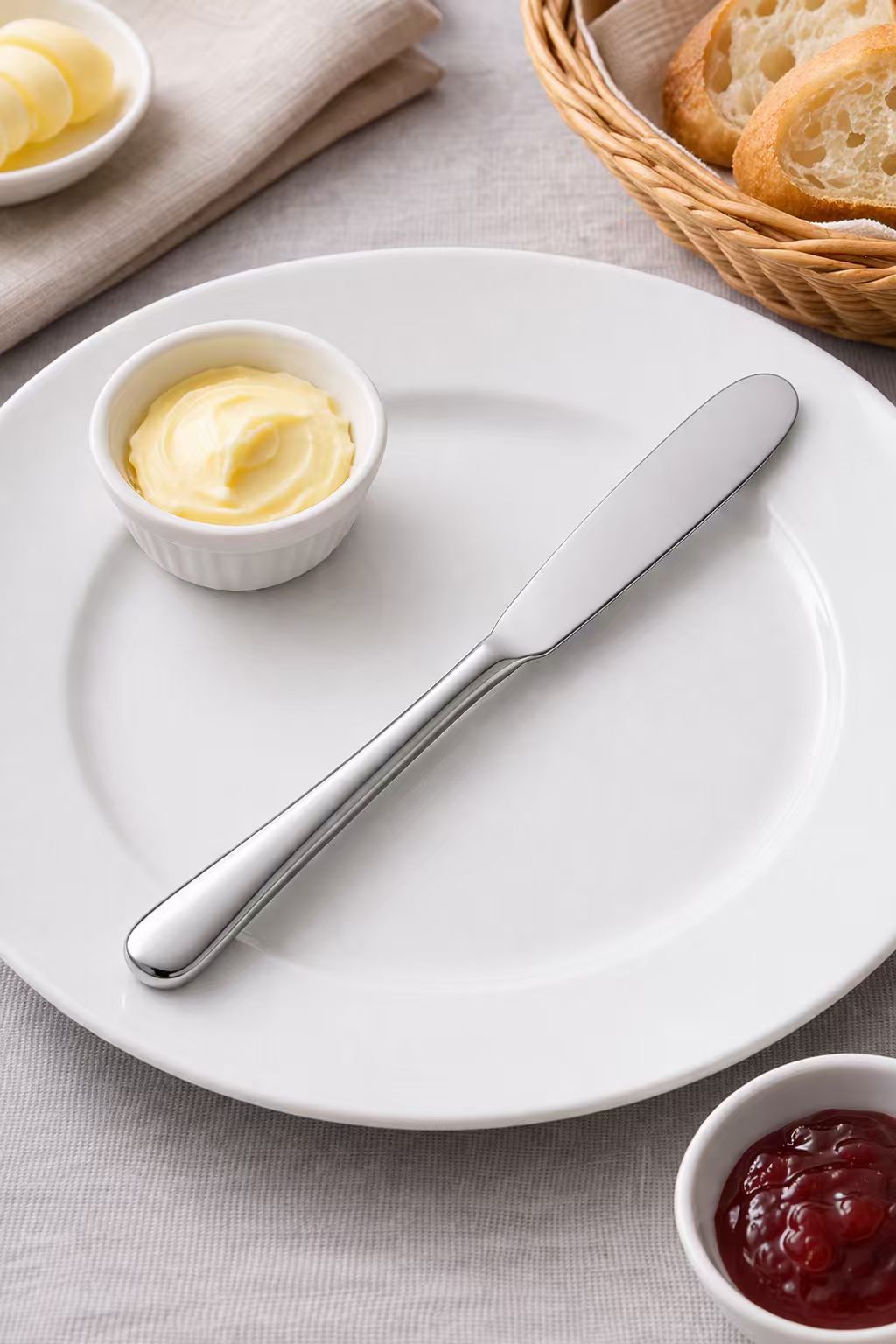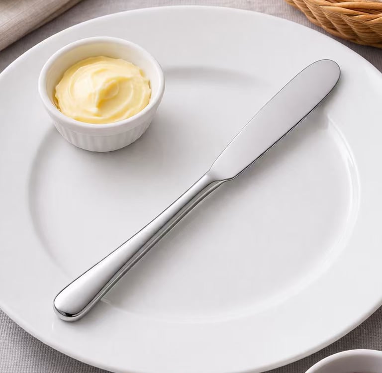 Defined by its rounded, blunt blade — purpose-built for spreading rather than cutting. Our butter knives run 16–19 cm and are a staple component in bread basket setups for hotels, bistros and airline catering. The blunt edge makes them safe for self-service buffet use, and the rounded tip is available in classic or spatula-style profiles. Frequently paired with dinner knife sets for a complete bread service.
