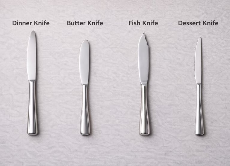Our knife range covers four distinct categories, each designed for a specific role at the table. Dinner knives carry the weight of the main course; butter knives handle the details with a rounded, spreading blade; fish knives navigate delicate fillets with their characteristic wide belly and notch; and dessert knives bring refined proportions to the final course. All four are manufactured in-house — one supplier, one shipment, one quality standard across your entire knife programme.