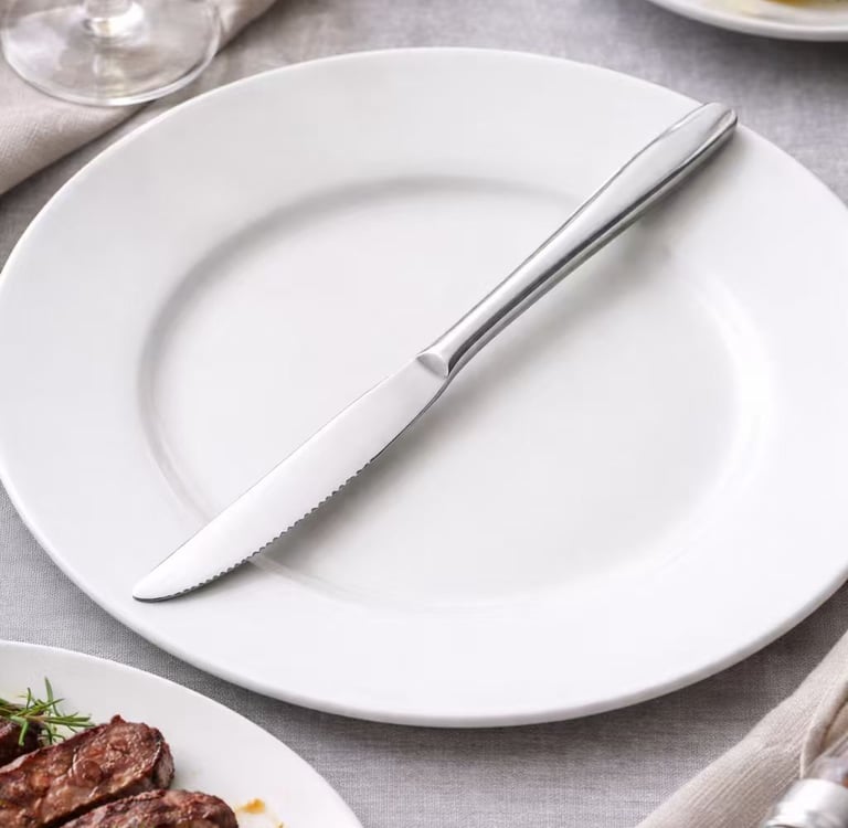 For high-frequency restaurant use, 18/10 stainless steel is the standard recommendation. Its nickel content delivers superior corrosion resistance and a mirror finish that holds through repeated commercial dishwashing. For steak knives or serrated edges, we recommend 420J2 hardened steel (HRC 52–56) for superior blade retention. We're happy to advise on the right grade for your specific end-use before any order is placed.